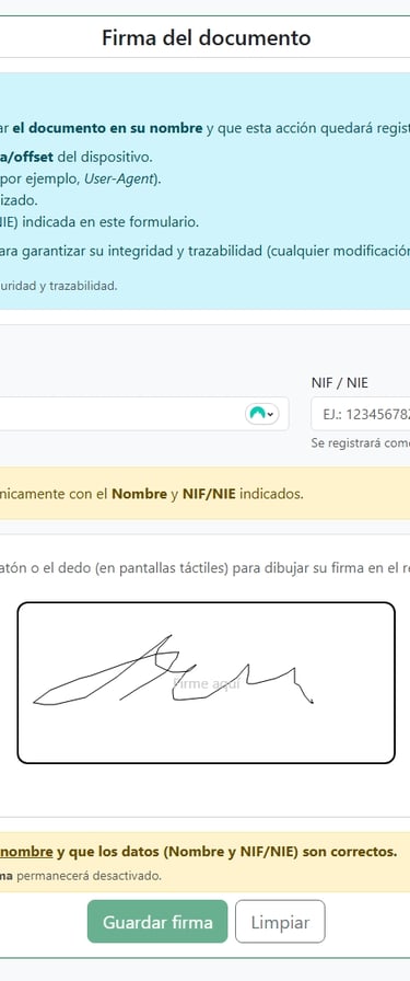 Antes de firmar, la app explica de forma transparente qué va a quedar registrado. Nada se oculta, nada se da por supuesto.